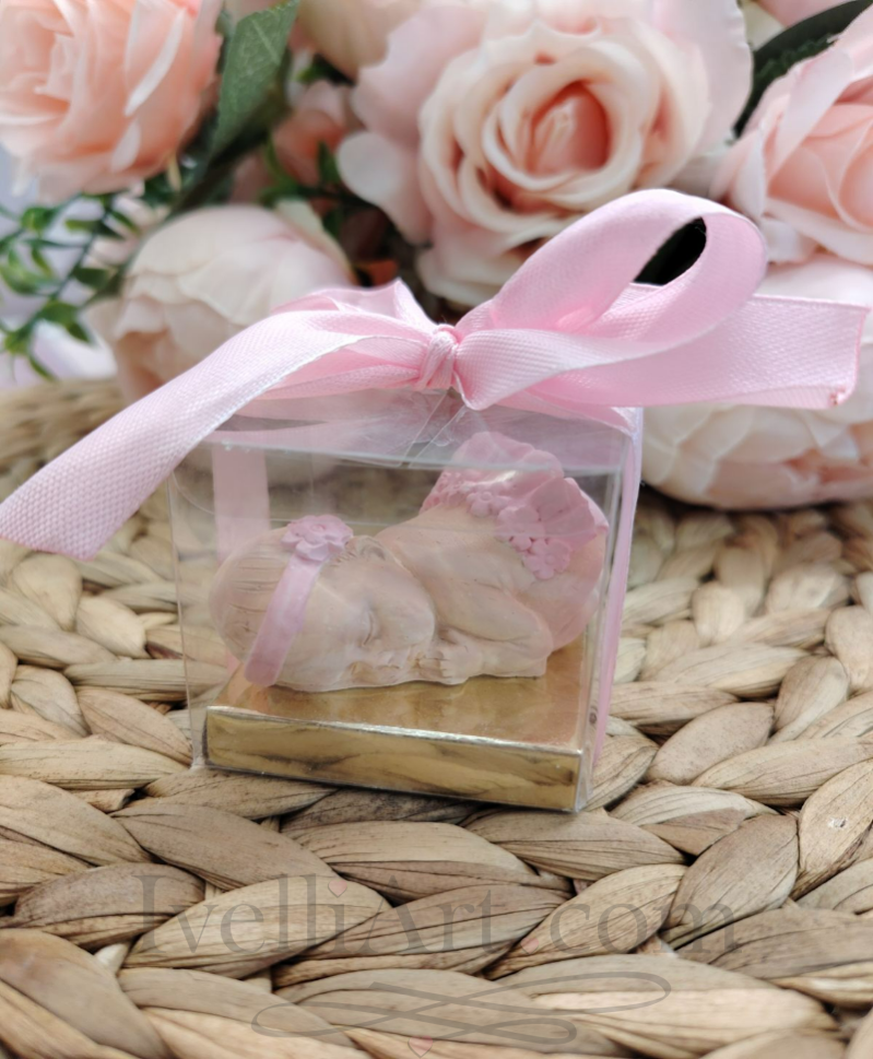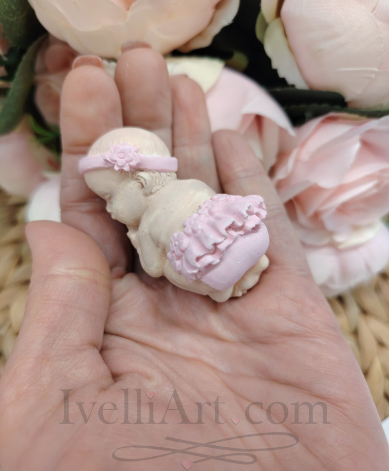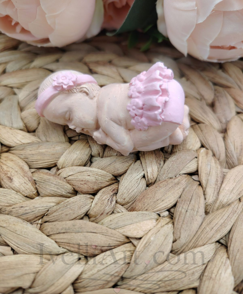Нежна фигурка на спящо бебе в розово от керамичен гипс около 6,5см основа – персонализиран подарък за кръщене, погача и прощъпулник от IVELLIART.