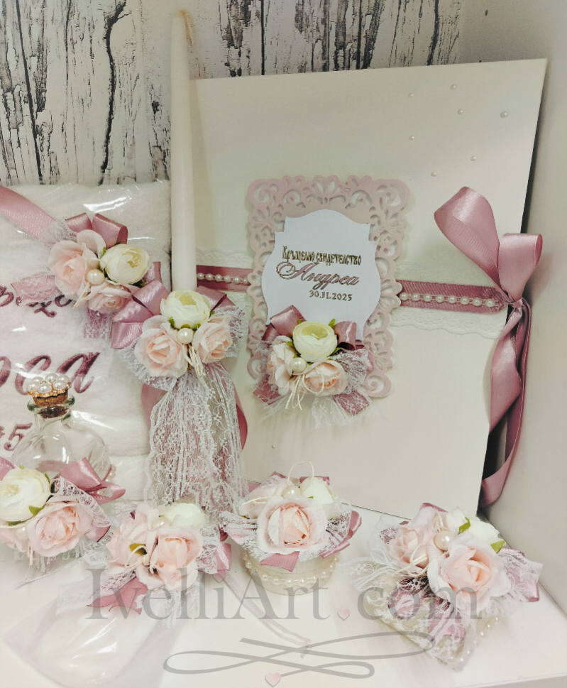 Комплектът е изработен в изключително нежен цвят пепел от рози, съчетан с декоративни рози, фина дантела и перлени детайли, които придават романтична и изискана визия. Цветът на комплекта символизира нов живот и надежда,любов и грижа, което се свързва със семейната обич и топлина и майчината закрила. Подходящ е както за самия ритуал в църквата, така и за красиви снимки и спомени от този специален ден.