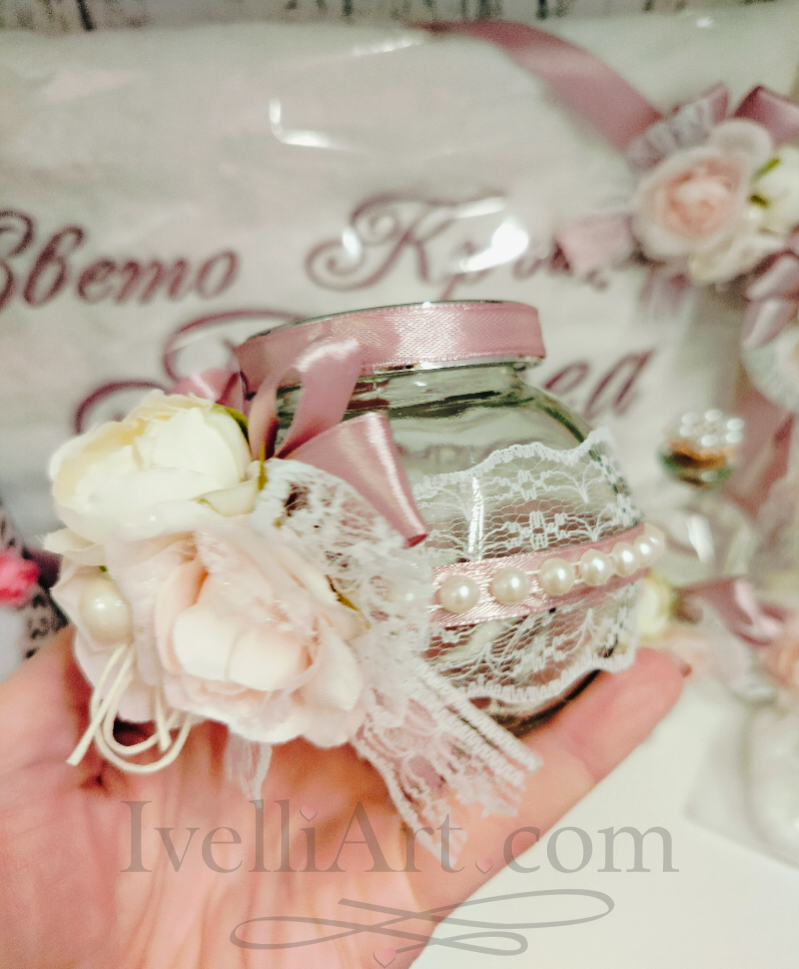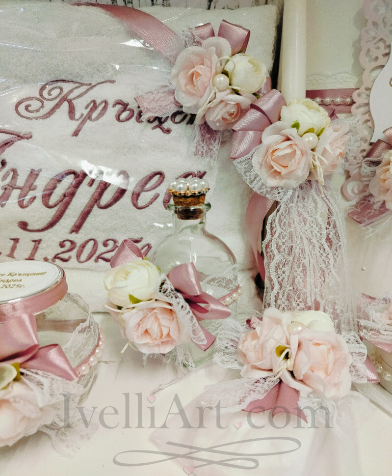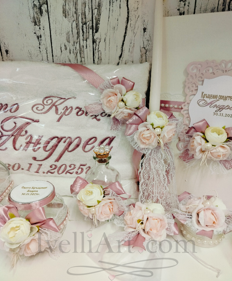 Луксозен комплект за кръщене ФЛОРАЛНА НЕЖНОСТ в 10 части с лична персонализация и стилно декорирани аксесоари. Нежен дизайн в пепел от рози, декориран с дантела, перли и красиви рози – изискан детайл за специалния ден от IvelliArt. Възможност сами да подберете аксесоарите в комплект.
