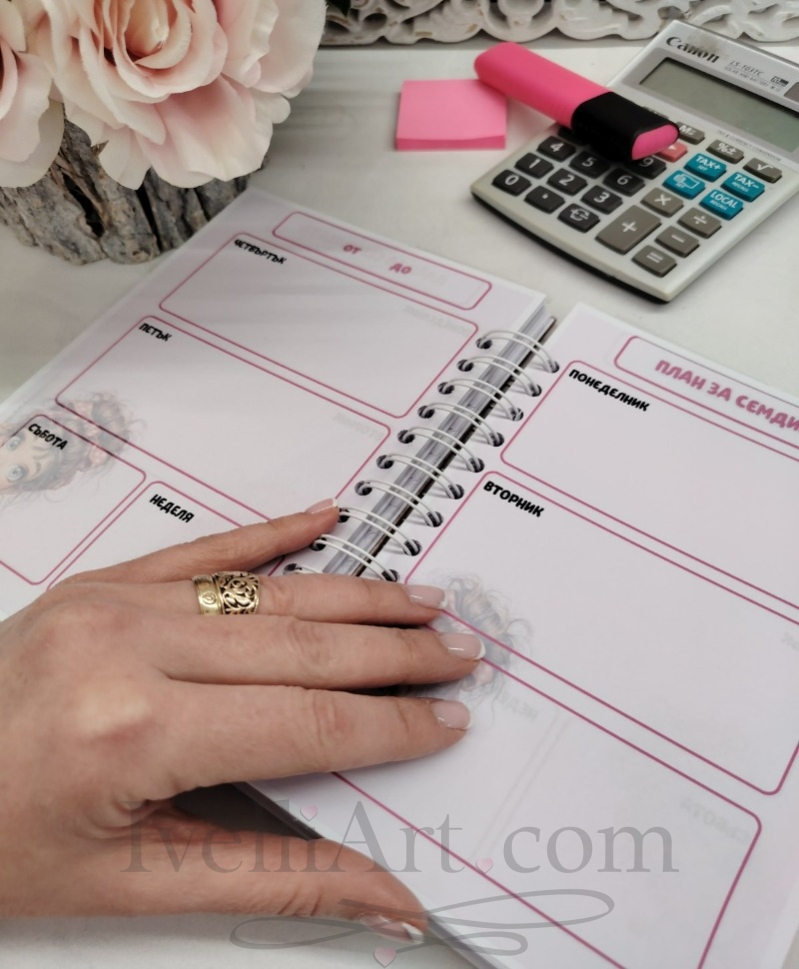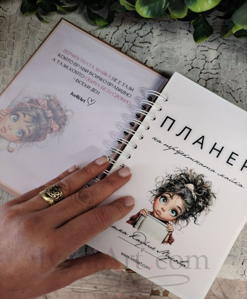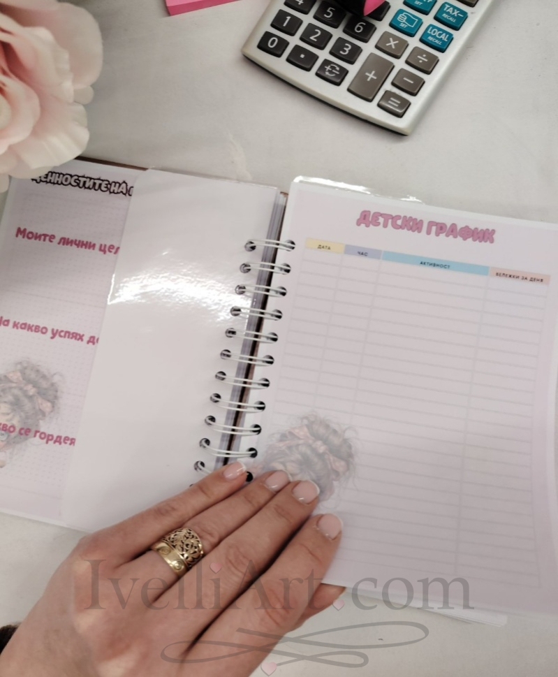 В него ще откриеш практично седмично и месечно планиране, детски график, полезни списъци, специална секция за семейни ценности и място, посветено на теб – твоето време, мисли и баланс.