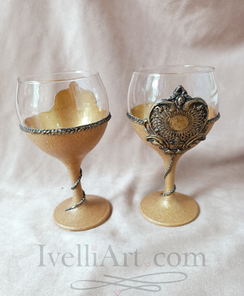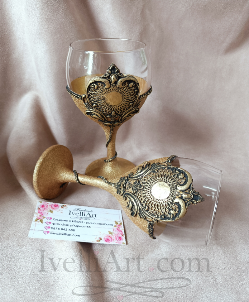 Две дизайнерски чаши за вино в антично злато – всяка внимателно декорирана с арт пластични елементи, наподобяващи уникален винтидж златен обков.