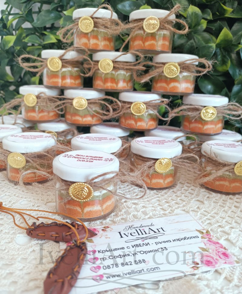 Поднесете на гостите си малко вълшебство с етно привкус с това красиво бурканче с шарена сол! Идеален подарък за кръщене, юбилей, сватба или специален повод, той е не само практичен, но и символичен – капачето е украсено с етно мотиви и персонализирано с име и дата на празника. Декорарано с канап и придружено от пендарче за берекет, за късмет и изобилие. Всяко бурканче е внимателно декорирано, за да остави топъл спомен у вашите гости.