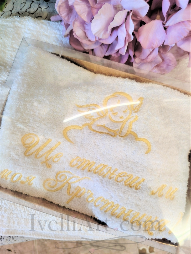 За още по-завършен вид може да я поднесете в красива кутия към нея (с промяна в цената). А сега специален комплимент към нашите клиенти – БЕЗПЛАТНА бродерия на декоративни елементи ангел в облак за още по-страхотна визия. Този детайл символизира закрила, доброта и благословия за детето, което я прави специален и запомнящ се жест. Бродерията "ЩЕ СТАНЕШ ЛИ МОЯ КРЪСТНИЦА?" се предлага във вариант за Кръстник, Кръстница или Кръстници. Можем да предложим бродерии на луксозни хавлиени кърпи с лична персонализация в още два размера : 50/90 см или 70/140см., както и всичко необходимо за Вашето Кръщене.
