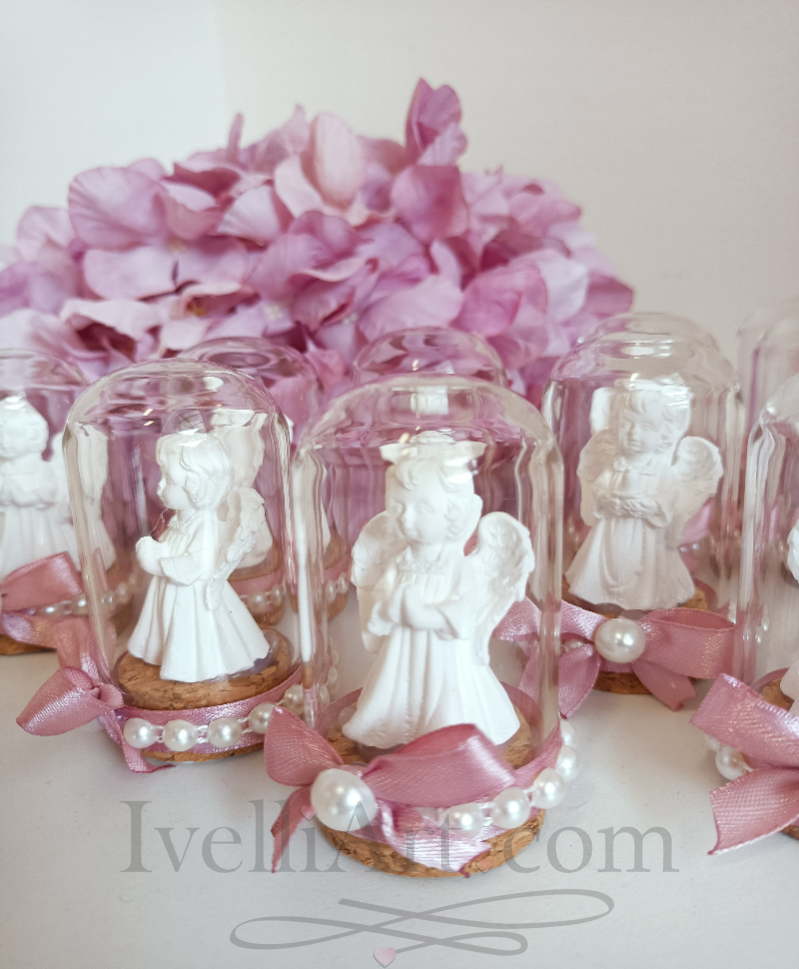 Нежно ангелче, поставено в елегантен стъклен купол – малък, но дълбоко символичен подарък за гости на кръщене. Персонализирана декорация, създадена да остави светъл спомен от този свят момент.