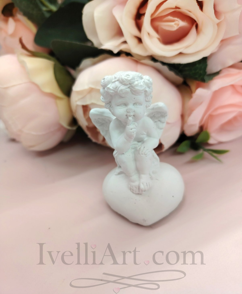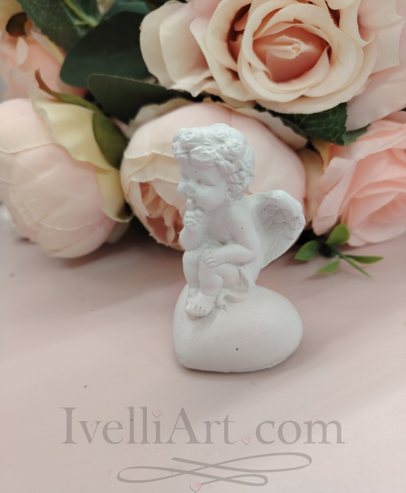 Ангелчето е символичен сувенир, подходящ като подарък за кръщене, погача, прощъпулник или изписване на бебе. Тази фигурка е изработена от висококачествен керамичен гипс и представлява ангелче около 7 см височина, което е седнало в сърце.