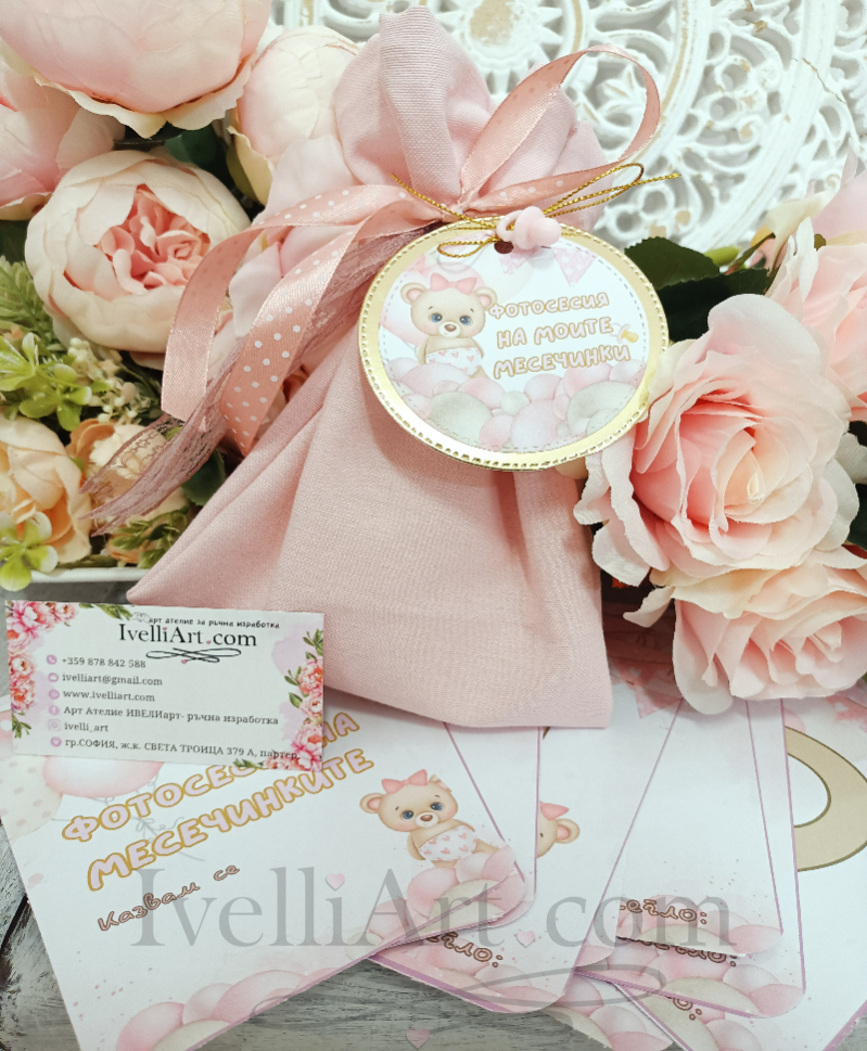 Бебешките фотокарти за месечинки 0–12 месеца от IvelliArt са създадени, за да запечатат най-ценните моменти от първата година на вашето бебе. Комплектът включва 14 премиум карти, които ви помагат да проследите развитието месец по месец и да създадете красиви спомени чрез снимки. Специапно изработена в розов плат чантичка за съхранение с тагче, което ще персонализираме с имеот на бебчо като подарък.