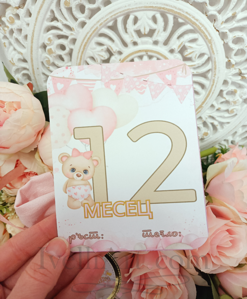 Дизайнът е нежен и стилен – за момиче с меченце, съчетаващ мекота и уютна визия. Всяка карта е предназначена с гръбче за снимки и отбелязване на важни моменти от периода 0–12 месеца. Предвидено е място за записване на ръст и тегло в предната част, което превръща комплекта в практичен и сантиментален спомен.